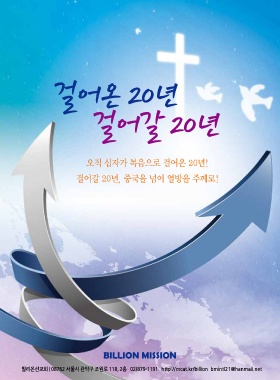 걸어온 20년 걸어갈 20년 오직 십자가 복음으로 걸어온 20년! 걸어갈 20년, 중국을 넘어 열방을 주께로! BILLION MISSION 빌리온선교회 | 08762 서울시 관악구 조원로 118, 2층 02)879-1191 http://mcat.kr/billion bmintl21@hanmail.net