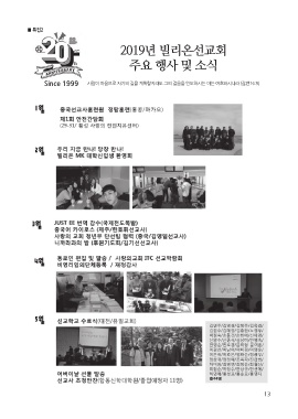 ■ 특집2 2019년 빌리온선교회 주요 행사 및 소식 Since 1999 사람이 마음으로 자기의 길을 계획할지라도 그의 걸음을 인도하시는 이는 여호와시니라 (잠언16:9) 13