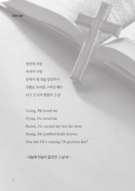 |생명의 말씀| 생전의 사랑 죽어서 구원 묻혀서 내 죄를 담당하사 부활로 우리를 구하신 예수 다시 오시리 영광의 그 날 Living, He loved me Dying, He saved me Buried, He carried my sins far away Rising, He justified freely forever One day He’s coming Oh glorious day! - 하늘에 찬송이 들리던 그 날 中 - 2